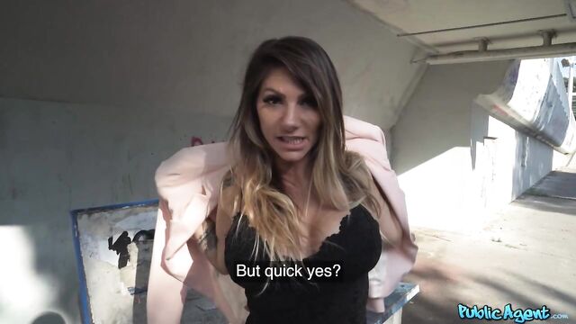 Description:The other day, Martin and I saw this sexy Italian MILF named Lily Veroni standing by herself at the side of the road. Her big, fake boobs were popping out of her black dress, and when we approached her, she told us she was single and had recently moved to Prague to work as a nurse. Martin explained that I owned a modelling agency and that I was looking to cast new models. After offering Lily 200 euros to show us her tattoos, she flashed us her round booty, then got out her huge, juicy melons! We offered her more cash for a blowjob, and since she didn't make much money, she accepted the offer and followed us to a secluded area. Once there, Lily got on her knees and started sucking me off. Seeing my big cock made the slim brunette horny, and she turned around so I could fuck her tight, wet pussy doggystyle. I stretched the busty babe's hole further in missionary, then I wanked off until I came in her mouth!