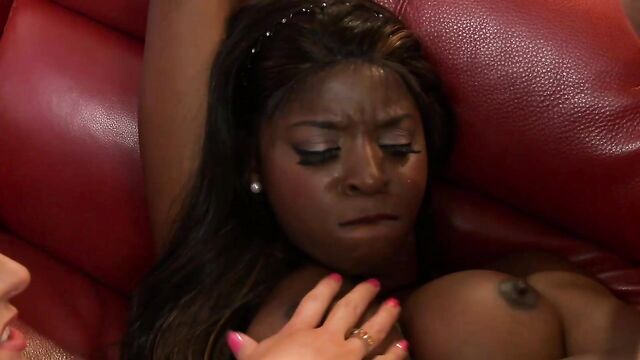 Ebony and her silicone tits white girlfriend love dick-riding