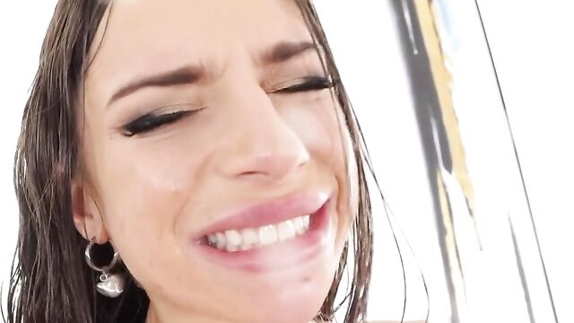 Description: Gorgeous April Olsen wears a pink latex dress, her slender, natural body oiled to a shine. She wraps latex around her tits and tugs it into her slot, pinches her thick labia and fingers her butthole. A thick, clear glass dildo provides a view into her rectal interior! Bald, pale stud Zac Wild drenches her tan skin in oil. He eats her pussy and rims her. April smiles blissfully as Zac's big cock slides into her asshole and reams it, his balls slapping her rear. He soaks her in more oil as he sodomizes her; she moans and grips her cheeks, spreading widely. April gives an ass-to-mouth blowjob; Zac grips her by the hair and fucks her throat aggressively. The dirty talking girl sucks dick lovingly, drooling. She rubs his boner in latex and then her naked cleavage. They enjoy oil-slathered pussy pounding and anal reaming in multiple positions, Zac alternating her slippery holes. With his boner up her ass, she sticks two fingers into her gash and says they can feel his cock! Zac lifts April bodily for a frenzied fuck. Her cheeks wetly booty-clap as she rides pole. 'Choke me while you fuck me in the ass,' she says, and he does. April kneels for a thick, sloppy cum facial.