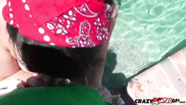 Description: Xavier was super psyched about his first Saturday off work in quite some time, and he really wanted to test out his brand new camera. His girlfriend May invited him to hit the pool, and the two headed out to the patio. May was a super cute Asian GF with a sexy body. While Xavier filmed May by the pool, she took off her jean shorts to reveal her hot Asian ass. May told him she just wanted to tan and actually sunbathe topless. She was hesitant about neighbors seeing, but quickly took off her top to reveal those plump Asian tits and delicious dark nipples. May was so excited he was finally home for the weekend that she even gave him a quick twerk show in the pool. That got her horny, so she really took the reward to a whole new level and gave Xavier some amazing head by the pool. He returned the favor before this couple decided to have sex right there on the patio. Xavier pounded that hot and tight little Asian pussy of May's deep and hard. She worked that dick like only a crazy Asian GF could until she sucked every last drop of cum right out of his cock.