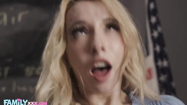 Description: Uninformed blonde freshman student Kenzie is surprised to see her stepbrother Clark in her English class and is even more confused when he announces he is the new professors assistant. And with innocent teasing on how hard he was going to test her Kenzie is willing to do anything to ease the work. Clark now is taken back when Kenzie lifts her skirt showing her soaked white panties and moist pussy and is ready to fuck his cock. Clark slurps up her dripping pussy juices and Kenzie gets an A+ grade on her cock sucking skills and how deep she swallowed his swollen meat. Clark fucks her tight little stepsister pussy deep and Kenzie just cannot get enough of sucking her sweet pussy juices off his dick until Clark explodes a nice hot load on her little pussy and belly.