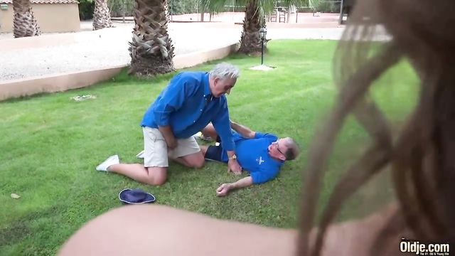 Description:Being young is great, being a young girl in an old men's world is amazing! Teen Bunny Babe is shifty and she knows so well how to get what she wants. All she needs is an old man, silly enough to believe her touching story about the virgin ugly duckling. She finds two old decent men and she almost begs them to have sex with her. The poor old guys are taken by surprise and start fighting about who should deflower the beautiful girl. But Bunny Babe has a plan: she shows them her fresh, naked body and seduces both with blowjob for their wrinkled dicks. Now the amazing threesome can start! Her hungry pussy wants to be penetrated by both men, she is flexible and gets fucked in odd hard position, enjoying and moaning when one rough tongue licks her clit... they are all so excited and they are fucking like crazy! The end of the story is easy to guess, Bunny Babe is now blackmailing those two sex partners... she just needs money for a disco party! Being old in a young girl`s word can be tricky but fun too!