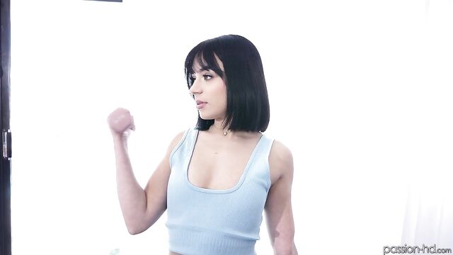 Description: Aria finished up a workout and is covered in sweat. She hops in the shower to soap up her body and masturbate. She emerges naked to seduce Brock for passionate sex.