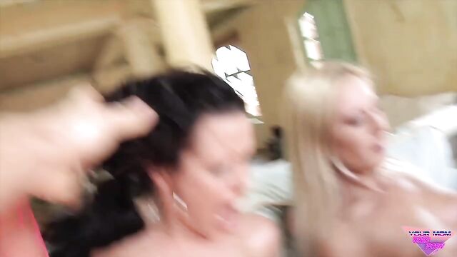 Curly brunette Liza and a hot blonde fucked by two massive dicks
