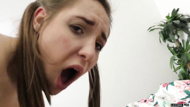 Description: While hanging out with her sexy and older man, things start to get fiesty. Her man takes her pants and thong off and starts to rub her sweet teen pussy lips while they kiss. She then gets on her knees to suck his big hard cock. They 69 for a bit so he can eat her sweet pussy. She starts off riding reverse cowgirl, giving us a great view of her shaved and barely legal pussy riding up and down big hard cock. She sucks his cock again and then they fuck while spooning and then cowgirl. He finishes up pounding that pussy doggystyle and then blows his load in her snatch