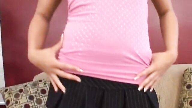 Description: Lovely Cadence Sweet wears shimmering lip gloss while smiling into the camera as she lifts her little black skirt and tight pink top while teasing her soft cotton panties. After removing her white bra and underwear she lays back on a sofa and spreads her sexy legs as she begins to massage her smooth pink pussy. While touching herself she grabs her clear glass dildo and begins sucking on the head, covering it with her saliva before she penetrates her cock-hungry pussy, pushing it in and out of her body while teasing her clitoris until she finds her climax.