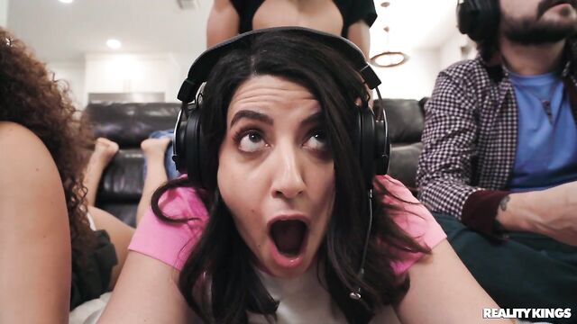 Description:Sarah Arabic's bf invited his buddies over to game, and now he's ignoring her! Sarah tries everything to get his attention, even flashing her big natural tits, and he still doesn't look up... but her friend Willow Ryder is more than interested! The girls start sucking each other's tits, and even scissoring right behind the guys. When Johnny Love notices what they're up to, they pull him onto the couch to let him motorboat them and suck out his cum. Dwayne Foxx catches sight of Sarah's big booty in her thong, so the babes take out his big cock and soon he gets to fuck them as they game.