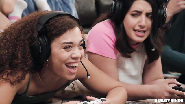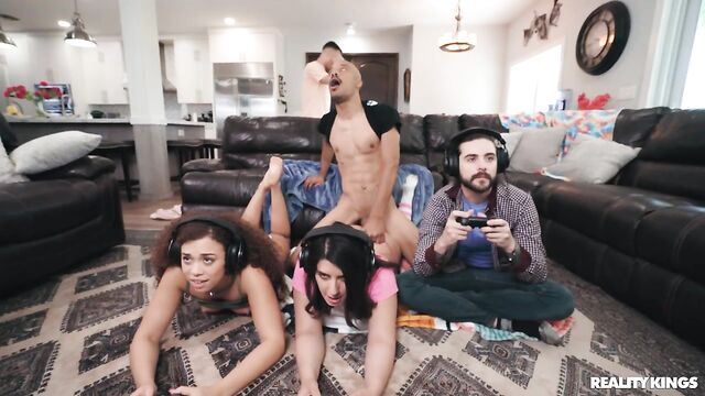 Description: Sarah Arabic's bf invited his buddies over to game, and now he's ignoring her! Sarah tries everything to get his attention, even flashing her big natural tits, and he still doesn't look up... but her friend Willow Ryder is more than interested! The girls start sucking each other's tits, and even scissoring right behind the guys. When Johnny Love notices what they're up to, they pull him onto the couch to let him motorboat them and suck out his cum. Dwayne Foxx catches sight of Sarah's big booty in her thong, so the babes take out his big cock and soon he gets to fuck them as they game.