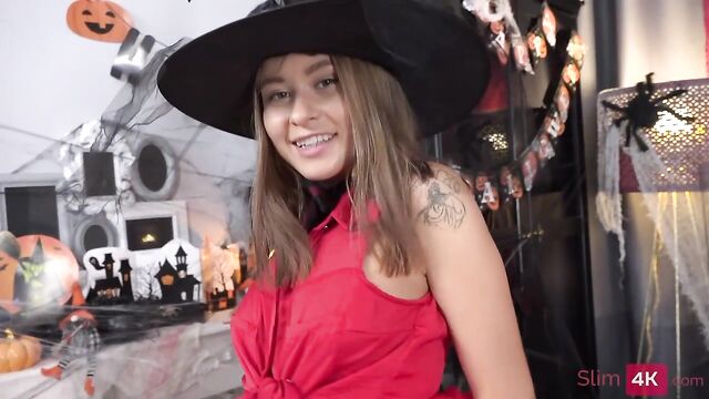 Description: Teen decided to surprise her BF and dressed in a witch costume for Halloween. She inserted the butt plug and waited for him. The dude was very surprised, but did not lose his temper and began to perform cunnilingus on her. After a portion of hardcore, the guy penetrated the ass and fucked the beautiful witch. After analysis, he came on her face and tits.