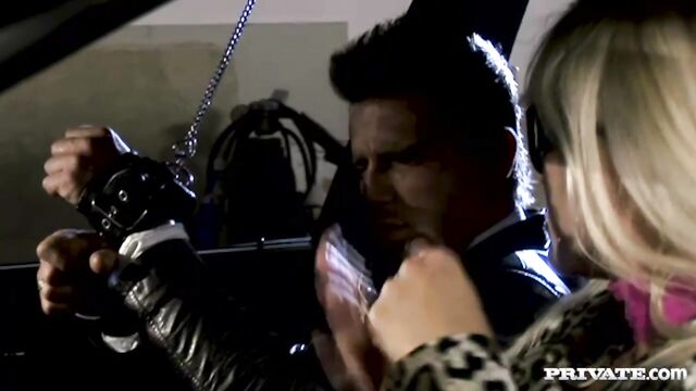 Description:Kathy Anderson is a kinky babe who has one man blindfolded and handcuffed inside a car. The room is dark so she grabs a flash light and starts to rub her pussy with it while another man watches. She gets into the car and starts to rub her pussy teasing the blind folded man with her screams of pleasure before taking it off and letting him watch her suck a hard cock. His wait is over, he is released and allowed to join in on the fun as he gets a shared blowjob from this horny blonde. After getting her pussy nice and wet with some finger blasting, the guys double up on her and give her some hard DP action sandwiching her between two stiff dicks. The guys blast her even harder and even deeper when they bend her over and tackle her round ass from behind. After, they flip her over and pound her some more giving her a really wild time. Finally, these guys shoot some seriously sticky cum shots into her open mouth covering her with cum.