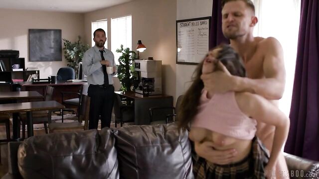 Description: Mr. Richards (Vince Karter), a high school vice principal, is relaxing in the teacher's lounge when Kimberly (Gal Ritchie), a student, sneaks in to speak with him. Mr. Richards can't help but grin, knowing that Kimberly must be here for a favor of some sort. Indeed, Kimberly explains that she is trying to qualify for a scholarship, but since she's been doing so many extracurriculars, her grades have dropped. She'll lose the scholarship unless Mr. Richards is willing to alter the grade she got on a recent exam.Mr. Richards is amused- this isn't the first time Kimberly has asked him for such an... unconventional favor. The last time she did, he got something in return: her virginity. So, if he's going to have to step in and save her once more, what could she possibly offer him that he hasn't already gotten from her? Kimberly is stunned, but in a moment of sheer desperation, comes up with an offer Mr. Richards can't refuse. If he helps her, she'll let him not only fuck her again, but she'll let him cum inside her too.Mr. Richards can't say no to that. He hikes up her skirt and starts fucking there and then in the teacher's lounge, with a shocked yet willing Kimberly going with it. Even when another teacher (Daniel Shar) comes in to grab some coffee, Mr. Richards continues without hesitation, chatting away with the teacher as if nothing was awry. After some free-use sex and a good pounding, Mr. Richards finishes with satisfaction, leaving Kimberly panting and breathless in the lounge.