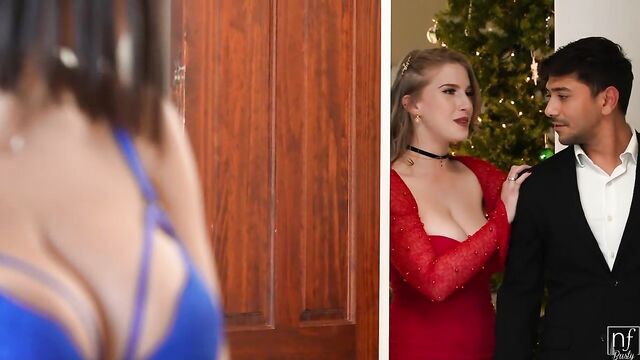 Description: Hailey Rose and her coworker Octavia Red are debating what to wear to the office Christmas party. Just as they're agreeing to try some clothes on, Hailey gets a text that Max Fills, their boss, is on his way to the party. Octavia suggest that Hailey have Max pick them up, and maybe they'll even be able to have some pre-party fun. Hailey agrees and texts her ask to Max.While they're waiting, the girls work together to slip into something sexy. Octavia slithers into a hot red dress that shows plenty of cleavage. Even as Octavia is complimenting Hailey's sexy bra and thong, they receive a notification that Max has arrived. Octavia tells Hailey that she'll go get Max and that Hailey should stay exactly as she is.Max is led in by Octavia and given no chance to protest when he realizes Hailey is wearing just lingerie. They swear they need his opinion about what to wear. As Max watches, the girls work together to dress Hailey in a super sexy dress that can't handle a bra. They spare him a wicket mutual smile and then come together to kiss one another before moving to the bed where Max is staring, stunned.When the ladies make their way over to Max, he's putty in their hands. The deliver one hell of a blowjob together, taking turns stroking and sucking as they keep eye contact between themselves. Gradually the girls undress down to their thongs, leaving themselves topless to take turns titty fucking their boss.Octavia takes the first go on the dong, straddling Max's hips and sliding down in cowgirl. Meanwhile, Hailey mounts Max's tongue so he can eat her pussy as he fucks Octavia. Turning around, Octavia continues in reverse cowgirl with Hailey rubbing her clit to make her moan nice and loud. Haily gets her own ride on the D as she takes Max for all he's worth in reverse cowgirl.Next up is a dicking down in doggy as Octavia takes her knees between Max and Hailey. Hailey gets her pussy licked and fingered as Octavia moans and rocks back against Max's strokes. When Octavia crawls forward to lay on top of Hailey, Max goes low to fuck Hailey while Hailey suckles Octavia's titties.Pulling out just before he cums, Max covers Hailey's big naturals with his juices. The girls enjoy the cum together, with Octavia taking a mouthful to share with Hailey. Finally sated, they agree that their bedroom party is better than a company Christmas party.