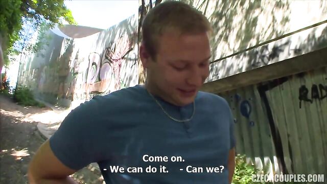 Description:This hunt was a thrill! Kristyna and I approached a Czech couple on the street. A dark-haired stunner and her lover – quite a stiff guy, but willing to accept our offer. Three thousand for a blowjob with a happy end in the public. My missus got wet from watching them and started sucking his cock, as she couldn’t hold back anymore. He fucking loved it! But his girlfriend couldn’t deal with it and she slapped him right in his face!!! Holy shit! The guy had a hard time calming down his furious girlfriend. We came to a mutually advantageous diplomatic agreement. We threw in a fat heap of banknotes and agreed that each guy would fuck his partner, and girls will eat each other’s pussy. We fucked them as they were leaning against trees, and we cum all over their faces in the end. A spectacular view. We rammed another Czech couple in the public! Enjoy the video!