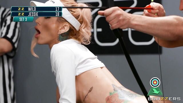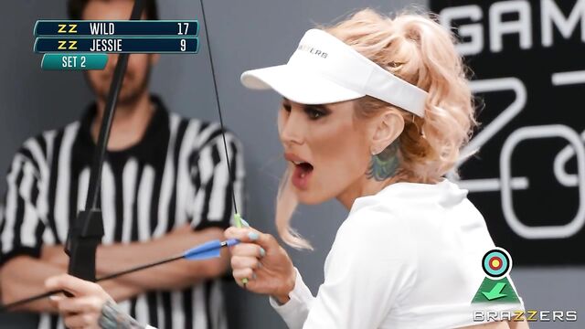 Description: Professional athletes Sarah Jessie and Zac Wild go toe to toe in an intense archery match! Fit blonde saboteur Sarah strokes, sucks, and fucks Zac while he aims for the target. Zac manages to hold his own until Sarah pulls a shiny butt-plug out of her ass, replacing it with Zac's huge cock. Will Zac go for gold, or will he risk it all for a chance to peg Sarah's tight little bullseye? Find out on The 2020 Brazzers Games!