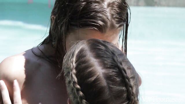 Description: Sexy blonde Casey welcomes her friends to the place where she’s house sitting, as episode two of Sandra Shine’s hot lesbian series "Three’s Company" begins. Snacking, dancing and sunbathing, Sarah Kay and her girlfriend Tina Tiny settle in and have fun. They are fooling around in the pool when Sarah decides to do a playful striptease, untying the strings of her bikini and swimming naked. Sensing the attraction between them, Tina encourages Casey to make a move on Sarah, then leaves them alone together. The girls flirt and kiss, Sarah straddling Casey’s lap as their embrace becomes passionate. She unhooks Casey’s bikini top and fondles her beautiful breasts, sucking her nipples to stiff peaks. Tugging her bikini panties aside, Sarah nuzzles her nose in Casey’s bush as she licks her puffy clit eagerly. They move to a comfy sofa on the patio where Sarah devours Casey, kissing down her body to her soaked pussy and eating her to a powerful orgasm. The tanned cutie straddles Casey in a sixty-nine, riding her tongue as she licks her even more greedily, giving her another intense climax. Now Casey concentrates on eating Sarah’s shaved pussy voraciously, sucking on her prominent clit to drive her wild.
