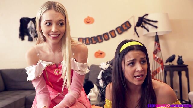 Description: Kylie Rocket and her friend Lily Larimar have dressed up in skanky Halloween outfits that show off all their best assets. Kylie's mom wants the girls to put a scarecrow out for trick or treaters, but before they do it Kyle decides they should have a little bit of fun. She leaves for a minute and comes back with a big dildo to put on the scarecrow. The girls take turns sucking it, then zip it into the scarecrow's jeans and proclaim it a sex toy. After Lily sucks the dildo a bit more, Kylie gets to her feet, lifts her miniskirt, and starts riding. She talks Lily into taking a turn by saying how good it feels!Saying that maybe they went a little too far with it, Kylie gets Lily to come out of the room. What they don't know is that while they were checking the candy Kylie's stepbrother, Nathan Bronson, put himself in the scarecrow outfit with his cock sticking out. Lily wants to play with their toy one last time, but when she finds a real dick she keeps it to herself. She starts sucking in a wet and wild blowjob, then lifts her skirt and starts riding scarecrow Nathan in reverse doggy. Kylie notices that Lily seems to be having a really good time. She comes over to watch and slips her hand beneath her skirt to masturbate. When Kylie insists on having a turn, though, Lily claims that's not such a good idea.Pulling her BFF aside, Kylie briefly strokes what she thinks is the dildo and then hops onto it. That's when she realizes she's riding her stepbrother's dick. While Kylie is freaking out about it, Lily decides to ride again. She eventually talks Kylie into rubbing her tits, which opens the door to a full on threesome. Kylie lets herself be talked into letting Nathan do her in doggy while she eats Lily out. Lily gets a turn in the middle as she lays on her back with Nathan's hardon between her thighs and Kylie riding her mouth. The girls swap spots so that Lily can make intimate eye contact with Nathan as he brings Kylie off and then reaches his own finish line. Pulling out, Nathan cums all over Kylie's stomach as the girls enjoy a satisfied kiss.