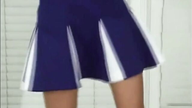 Description: A lustful cheerleader bounces her pompoms while wearing a short navy and white striped school skirt. This horny girl gets topless and exposes her small firm tits while slowly and seductively pulling her skirt down. Wearing only cotton panties, she slides her hands into her underwear to feel her wet sensitive pussy, then strips her pantie and shows off her deliciously swollen large pussy lips. Sitting down and spreading her legs, she stuffs her fingers into her mouth to get them wet then massages her saliva onto her vagina while making herself cum.