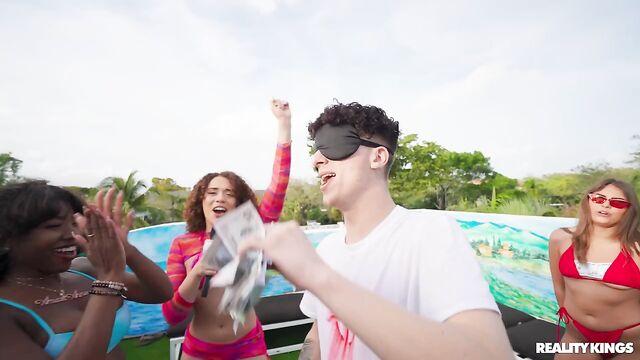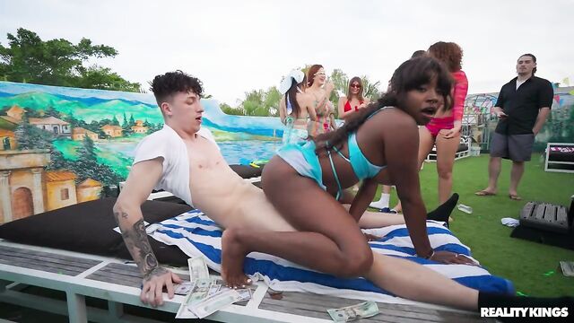 Description: There's only one place to be for Spring Break parties, and that's why Willow Ryder is in South Florida with a stack of cash to show that Money Talks. Willow just has to shake her booty on the sidewalk to locate a rooftop party, so she heads up to get things started with some spicy questions and dares. Willow organizes a wet t-shirt lap dance contest with sorority girls Selina Bentz, Daisy Lavoy, and Nia Bleu and makes it rain. Then it's time for Ethan Seeks and Nicky Rebel to play against the gals in water balloon target toss. The last game has a blindfolded Ethan hunting for cash, and he gets his hands all over pretty Amari Anne. Soon she's sucking his cock and getting eaten out in front of all their pals, and the pair of winners indulge in an outdoor fuck on top of their pile of bills!