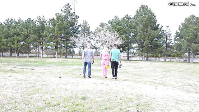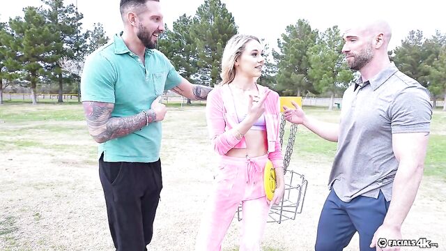 Description: Kelsey Kane plays disc golf with 2 guys and distracts them with her hot body. After the game, they go home to double team her and cover her face with cum.