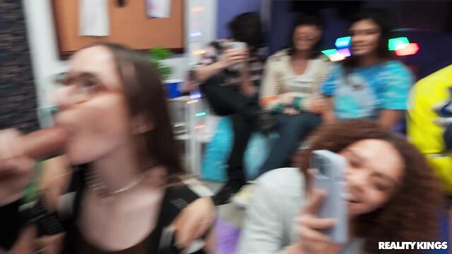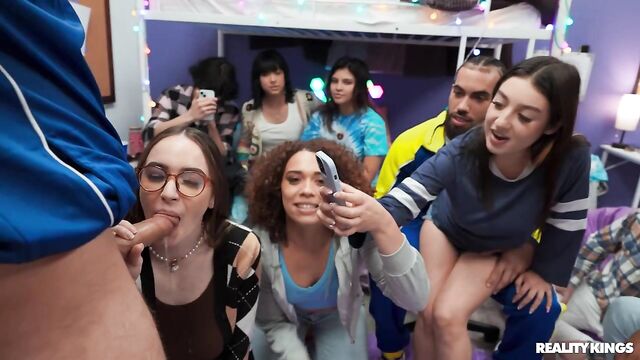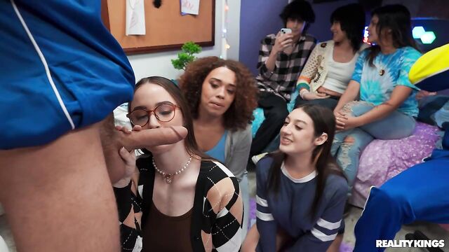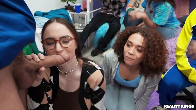 Description: The friends are coming to hang in their dorm room tonight, and Willow Ryder and Violet Gems encourage their nerdy roommate Hazel Moore to dress a little less prudish. When the girls find out Hazel's a virgin, they give her a quick lesson in shaking ass and sucking dick before everyone arrives. Willow starts things off with a game using sex dice, and before long Hazel's sucking Kai Jaxon's cock. The babes suck James Angel while Hazel gets her first fuck, and this dorm orgy really heats up when Kai and James spit-roast Willow!