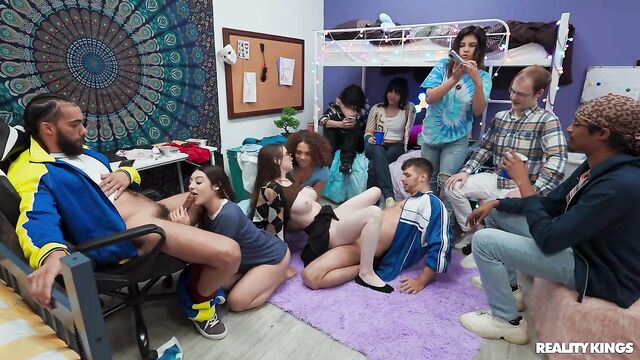 Description:The friends are coming to hang in their dorm room tonight, and Willow Ryder and Violet Gems encourage their nerdy roommate Hazel Moore to dress a little less prudish. When the girls find out Hazel's a virgin, they give her a quick lesson in shaking ass and sucking dick before everyone arrives. Willow starts things off with a game using sex dice, and before long Hazel's sucking Kai Jaxon's cock. The babes suck James Angel while Hazel gets her first fuck, and this dorm orgy really heats up when Kai and James spit-roast Willow!