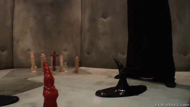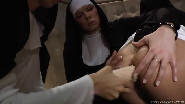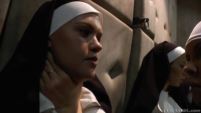 Description: John's comment: 'It is Rain DeGrey's job to keep the bad girls assigned to her in line, with their asses spread. The two superstars in this quartet of punished nuns are Roxy Raye and Ashley Fires. Watch out for huge gapes! The 'Ass Devil' rubber toy gets involved as this debauchery plays out in a padded room meant for crazy people. Chastity Lynn and Jessie Volt spread and assist. May the devil be with you!' IMPRESS ME, LADIES: Mother Superior Rain DeGrey is on a mission to exorcise the convent of evil. She lines up her sisters -- Chastity Lynn, Ashley Fires, Roxy Raye and Jessie Volt -- explaining that the devil hides in dark places. The only solution is to root him out by probing the nuns' assholes with huge dildos, made slippery with sanctified lube. Fucking their mouths with a communion phallus, she uses vibrating wands to expel Satan from their hearts. After Mother Rain's holy anal inquisition, she orders the girls to pray to rubber crucifixes protruding from their gaping rectums!