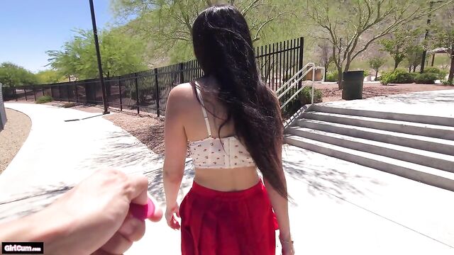 Description: Angel Gostosa cums all over the park with a remote controlled vibrator. She goes back to her house and gets fucked to even more orgasms.