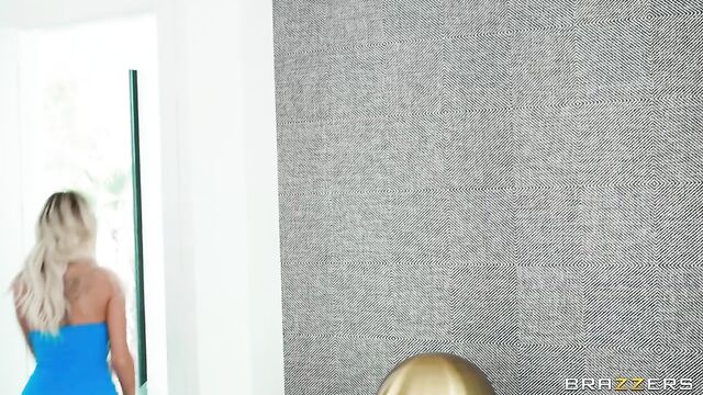 Description: Blonde Ema Karter bought a selection of hot, new outfits for a date tonight. Unfortunately, her prankster roommate Xander Corvus will do anything to sabotage her plans. While fit Ema is distracted, Xander swoops in and replaces her banging new outfits with smaller versions of the same clothing – so when Ema goes to try on her options, nothing fits! Naturally, Xander is filming Ema sexily struggling to put on each item from a crack in her bedroom door. When Ema catches on to Xander’s silly scheme, she pounces on him and demands to know what he did with her clothes. Xander refuses to tell her, mesmerized by her big tits popping out the top of her too-small dress. Ema knows the most effective way to get this information – fucking it out of him!