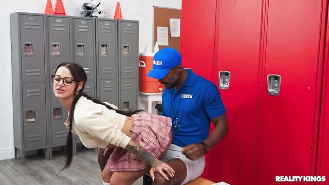 Description: Horny college nerd Evelin Stone picks her moment to sneak into the men's locker room, and immediately hits the motherlode: a hamper full of sweaty shorts to sniff! When the coach and players come in, Evelin hides in a locker, but gets caught by coach Dickdealer Don. Evelyn butters him up and soon is sitting on his lap and getting her tits squeezed and played with as she grinds on his dick. The hot coach stretches out her pussy and tries to stay quiet while she sucks him behind the players' backs. Evelin rides him on the floor and takes the coach's load on her glasses.
