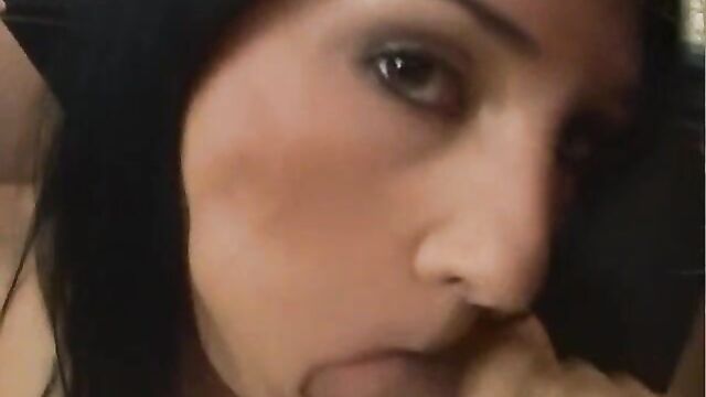Double blowjob in the bedroom with a hot brunette Persia De Carlo