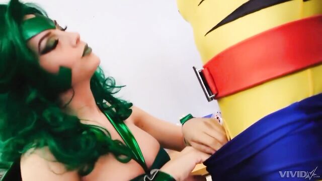Super woman in green Chanel Preston jumps on a long boner