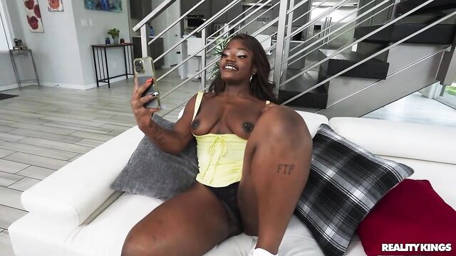 Description: Ameena Green is shocked when she gets home and finds her roommate, May Hashira, shamelessly taking pussy pics on the living room couch, but she can't deny she's kind of turned on, too. Curious after her bestie's encouragement, Ameena goes to her room and takes a good look at herself in the mirror. She starts touching herself, even taking out a toy and sticking it to the mirror so she can see how it looks as she fucks herself! May comes upstairs and watches her normally straitlaced roomie taking a dildo in her pussy and just has to have a taste. Ameena lets her hair down as the babes lick each other and 69, then trib and fuck each other with the toy!