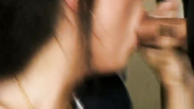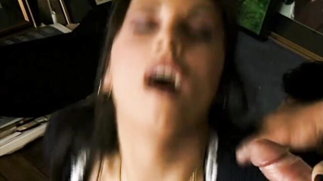 Description:Mercedes is in an art shop and is confronted by two men looking for an art thief. They take her upstairs where she proceeds to suck on their dicks one after the other. While one guy fucks her hairy pussy she strokes and sucks the other one. The men double penetrate her and finally cum on her face.