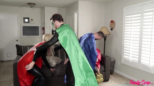 Description: What would happen if four families each contributed one member to create a new family? In this episode of Family Swap, Hime Marie and her swap brother Kyle Mason have joined their swap parents Sophia West and Charles Dera in a costumed marathon. They're eager to get home and shower, but there's a problem: they can't get their skintight body suits off. Soon enough, both girls are on their knees trying to help the boys out of their suits. When the suits both rip to let the dicks dangle free, the girls are both shocked and aroused.Hime is the first to start sucking as she opens wide to take swap daddy's fuck stick in her mouth. Sophia isn't far behind. The boys want more than just a BJ, and the girls are more than willing. Hopping onto the couch, Sophia and Hime get on their knees. Kyle slides home into Sophia's twat, while Charles fills Hime's cooch right up in doggy. The boys take a seat on the couch while the girls swap partners. When they resume fucking, Sophia rides Charles's fuck stick while Hime rides Kyle's.After a brief interlude where the ladies suck their own juices off their respective dicks, they get on their backs so they can get their pussies pounded. Charles takes on Hime's pussy, while Kyle goes back to his swap mommy Sophia. As Charles reaches his big finish, he shoves deep to give Hime a big creampie. Kyle pops a moment later to give Sophia a matching pussy full of cum that dribbles from her greedy snatch.