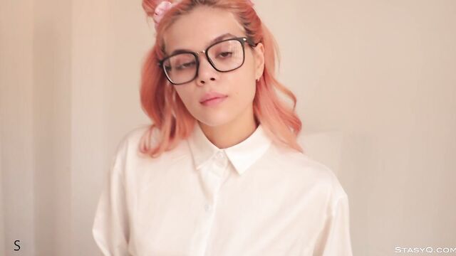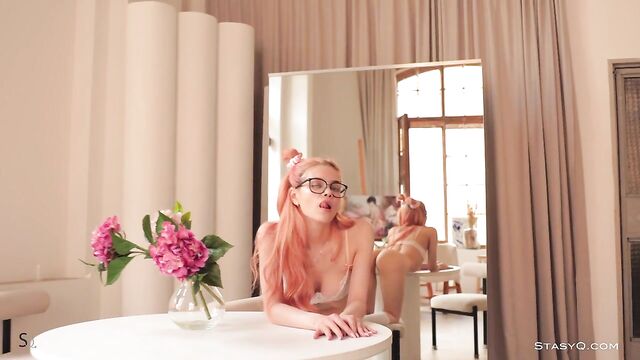 Description: You won't believe how cute and sexy this StasyQ model is. Her name is Maya Nguen, and this temptress stands out for her red hair, gorgeous breasts, and sassy attitude. Video Release 622 shows Maya's beauty in all its glory, thanks to the supreme camera of Said Energizer. It all begins with Maya Nguen sitting by a large window, wearing a plaid skirt, a geeky sweater, and nerdy glasses. Her hair is up in two buns, and her long legs are accentuated by white knee-highs. It's not long before Maya Ngen takes off her shirt and skirt and reveals white lingerie. Her panties are absolutely tiny, and her lacy bra barely contains her big breasts. This all-natural beauty continues to explore her body in front of a large mirror while staring at the camera and pouting her lips at the same time. The only thing she keeps on is her glasses.