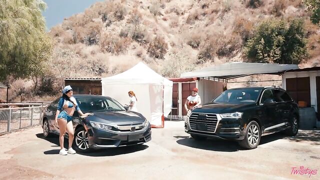 Description:Rival car wash girls Lily Lou and Nicole Doshi get competitive as they suds up their bodies and the vehicles, but Lily goes too far when she pours a bucket of water over the car Nicole just finished drying! Nicole pushes Lily inside to take her revenge... sucking the pink-haired hottie's big tits! If this is revenge, Lily wants more, and soon she's licking Nicole's pussy before sitting on her face. The babes sneak into a tent where they have a very special car wash of their own, licking and fingering each other till they squirt, then they scissor and 69.