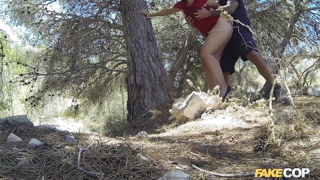 Description: You have to forgive me for mistakenly thinking this hot Spanish smokeshow Pamela Sanchez standing by the side of the road was a prostitute. What a pleasant surprise to find out within minutes that even if she wasn't a working girl, Pamela still fucks like a whore. After chatting with her for a few minutes, she told me her car was broken down, and she needed some help from a big strong policeman such as myself. I was hoping for a look at her big tits, but Pamela upped the stakes by proposing a blowjob right out of the gate. I drove over to her parked car, watching her big thick ass jiggling in that red dress while she walked off. Right there in the open, Pamela sucked my hard cock, blowing mne like a naughty girl with no worries about being spotted by any passing strangers. She didn't mind my camera rolling a POV sex tape while we fucked, and opened her mouth wide while I striped her face with jizz right there in the woods!