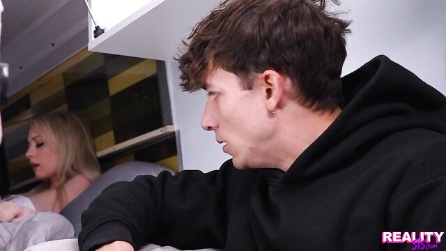 Description: Cecelia Taylor and her stepbrother Parker Ambrose are having a road trip in their camper van. When Parker goes for a walk, Cecelia makes a teasing sexual video for her boyfriend. Soon she's masturbating in her thong. Things are just starting to get good when Parker returns.Unwilling to stop, Cecelia hides under a blanket and keeps on fingering her clit. She doesn’t do a very good job of holding the moan, and Parker notices. Cecelia invites him to cum on over, and he does as he's told. Once Cecelia has enjoyed her stepbrother's hands on her hooha, she goes to work sucking him off.The van is pretty close confines but petite Cecelia still manages to ride her stepbrother's fuck stick. They go for it in spooning next, with Cecelia rubbing her clit. Getting to her feet, Cecelia Bends over the chair so Parker can dick her down from behind. Finally sated, she gets to her knees to suck her stepbrother off until he rewards her with a nice facial.