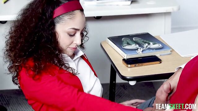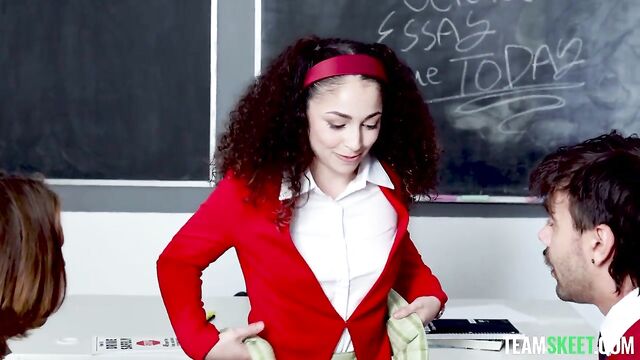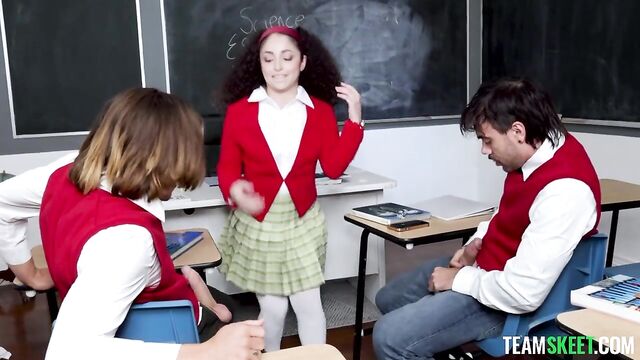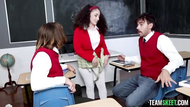 Description: The teacher is absent today, so Pixie, the teacher’s pet, is put in charge of the class. She needs to make sure everyone writes their essays, but she is stuck with Axel and Nade, the two bullies and also the worst students in the class. Knowing her classmates won’t be able to focus, she negotiates: they’ll do a fun game first and then get to work. Pixie proposes to the boys some games, prompting the guys to tease her for being so naive. However, Pixie is so obsessed with sex that she immediately finds a way to spice the games up. Axel and Nade stop teasing her as soon as they realize they will get a kinky taste of the teacher’s pet. The game starts escalating from a series of horny challenges to one hell of a threesome that gives the boys the right motivation to do their homework.