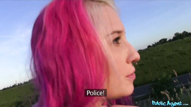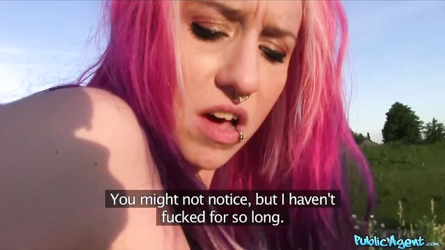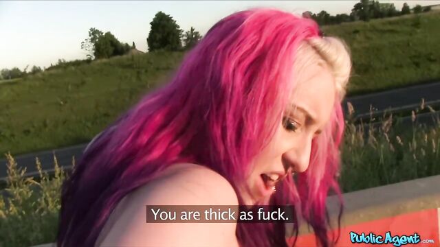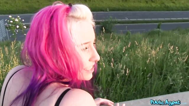 Outdoor sex session in the missionary pose with a pink-haired chick
