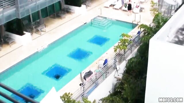 Description:Ever since this dude saw his GF making out with a rando hottie on their vacay, he's been jonesing hard to get his rocks off. Leah sucked him off by the hotel pool, then he couldn't hold back, and had to get deep in her Latina pussy then and there.
