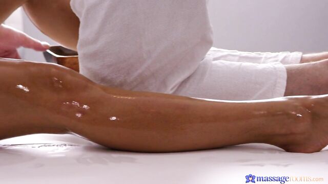 Description: Sweet Italian girl Jessy Jey hires studly masseur Steve for an oily rub down in the Massage Rooms. With Jessy face down naked on the bed, Steve oils up and rubs her feet, then works his way up her calves and thighs. Steve removes the towel from Jessy's big booty, then spreads her legs and teases her pierced pussy lips. Steve licks and kisses her oiled pussy, and Jessy squeezes her own perky tits as she cums on his face. Jessy rewards Steve with a blowjob, then he inserts his hard cock into her oiled, wet pussy. Steve fucks Jessy in missionary so good that she kisses him passionately, then lets him fuck her in doggystyle and spoon, before sucking his dick until he cums in her mouth!