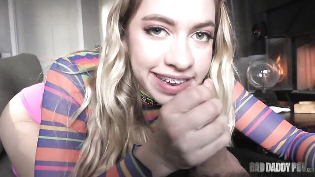 Description:Young slut Khloe Kapri is snuggled under her blanket to keep herself warm during the cold weather. The teen blonde is wearing a multicolored sweater, pink panties, and pink high socks. The blanket is not enough to keep these hot babes warm. She needs something more. Lucky enough, her stepfather is there to provide her with the warmth she desires. Khloe cuddles up to the man of the house and reaches out for his cock. She wants her stepdaddy to make her petite body sweat, and the only way to do that is to fuck her to the extreme. Her stepfather was taken aback at first, but it did not take too long before he enjoys the situation. He lets his stepdaughter suck his huge cock. The raging lusts of the two begin to take over their body. They went inside Khloe's bedroom to finish what they started. Khloe quickly bends over on the bed and offers her tight pussy to her stepfather. Her stepfather doesn't want to leave her stepdaughter hanging, so he quickly shoves his huge cock into her already wet pussy. They change their position from doggy style to cowgirl. Khloe spreads her legs apart to make her pussy more visible. The sight of her stretched-out pussy and perky tits is enough to make her stepfather wanting for more. They change their position again to reverse cowgirl before settling to missionary. Her stepfather pounds his cock into her wet cunt like a crazed maniac. Khloe can feel his cock digging deeper and deeper into her vaginal canal. Her screams of pleasure fill up the room as her stepdaddy continues to aggressively slide his cock in and out of her pussy. Khloe's body shivers wildly as she cums multiple times. Her stepfather keeps on fucking her in the pussy until he feels like he is about to cum. He pulls out his cock from his stepdaughter's pussy and strokes it directly above her pretty face. After a few strokes, he blasts Khloe's face with a huge load of thick cream. Khloe is now feeling warm. As a sign of gratitude, the cumwhore cleans her stepfather's cock with her mouth.
