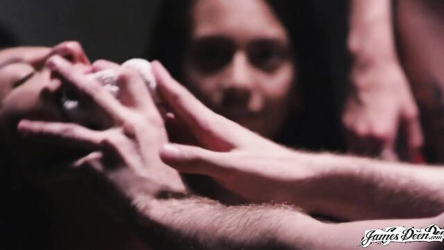 Description: Taking part in a threesome can be said to be one of the most common fantasies of a virile man, maybe even a foursome with three beautiful women. But James Deen takes it a step beyond by gathering nine stunning women who are horny beyond belief and ready to get fucked out of their minds. Walking down a dark hallway, James gets welcomed by a group of voluptuous women who are fully naked and waiting for him to take the lead. Quickly stripping off his clothing and throbbing cock springing free, the lone man takes on the challenge of satisfying each aching pussy in the dimly lit room. Not known for being gentle, James grabs the nearest babe by the neck and makes her get down on her knees for a frantic blowjob. With no available furniture in the room, he harshly pulls on Dani Daniels’s hair and makes her bend over to thrust into her until she's screaming in pleasure. Envious eyes glued to the two of them, eight women impatiently wait for their turn to get a taste of the sensations James's talented cock can elicit. Turning his attention to a blonde, lifting one of her legs and slips into her with ease. The process of harshly fucking mouths and pussies in various positions cycles, several girls already on fours with sopping cunts ready for the rugged James Deen to give them a dose of sexual heaven. Some of the cock-deprived babes end up scrambling on top of each other to get the chance to lick his glorious ramrod. The darkened room filled with frantic smacking, hands slapping against a cheek, choking, and uninhibited moans. Nearing the end, James uses Janice Griffin's pussy while ordering the other girls to position themselves on the floor in front of him. Pushing off the brunette, he jerks himself off and showering the ladies in front of him before walking out of the room, knowing his goal is accomplished.