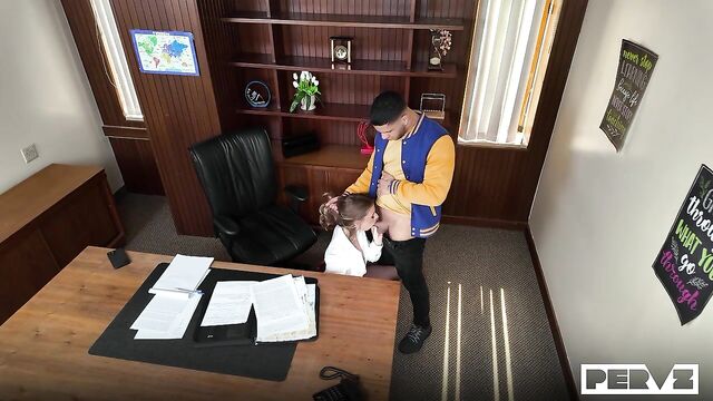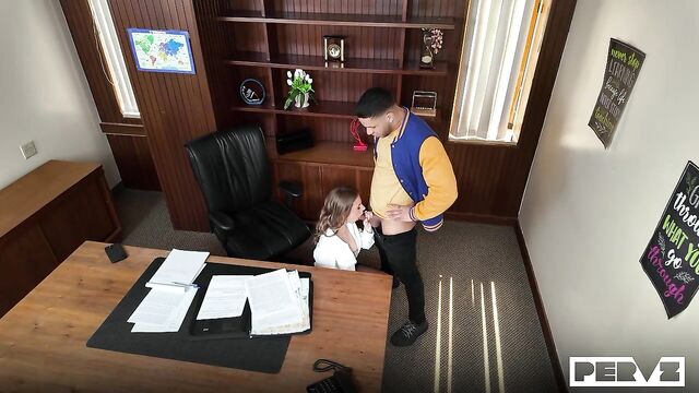 Description:Mike is absolutely convinced that Ms. Olsen is out to get him. Low grades, detentions, and all kinds of punishments are making this jock’s senior year a living hell—and he’s determined to get back at her, no matter the cost. One day, he catches Ms. Olsen engaging in inappropriate behavior on school grounds, and he secretly records the whole thing on his phone. Later, he confronts her in her office and tells her what he saw. Anya tries to brush him off with threats, but Mike shows her the footage. Now, her job is on the line—and it’s up to Mike whether she stays or goes. The horny student starts fondling her, giving him a clear idea of what he has in mind. Ms. Olsen plays along, striking a horny deal with her student, sealed with hot cum, to keep the whole incident under wraps.