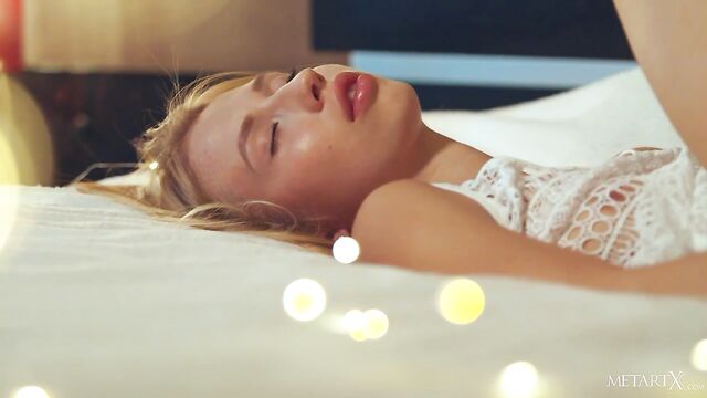 Description:Sexy blonde Dominica relaxes on her bed, so cute in a crocheted white dress. The green-eyed Belarusian babe runs her hands over her silky skin, pulling off her dress to bare her lovely small breasts, and stroking her shaved pussy through her lacy white panties. She gets naked, rubbing her clit in delicate circles, luscious lips parted in a sigh of pleasure. Moving onto all fours, the slender beauty masturbates avidly, rocking back against her fingers. She lies back, knees by her head to spread her pussy open wide as she frigs to an overwhelming orgasm.