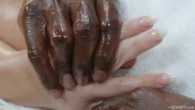Description: Cute blonde Lovita Fate indulges her sensual side in episode four of Nik Fox’s erotic series "The Ultimate Massage." Ebony stud Joss Lescaf works on her shoulders first, then pours oil over her back as she lies naked on the massage table. He kneads the pigtailed babe’s hot ass with his strong hands, then pours more oil down the crack of her ass, making her gasp. As Joss spreads Lovita’s thighs and strokes her shaved pussy with slippery fingers, her breathing grows heavy. He leans over the table and she grabs his cock, freeing it from his pants and stroking it until it swells to its full impressive length. Wrapping her lips around the head, Lovita starts to inch it into her mouth, opening wide to take it as deep as she can manage. She moves into doggy so Joss can slide his huge cock into her oiled-up pussy from behind, making her moan with each deep thrust. He holds still so she can rock her pussy back onto his thick shaft over and over, then turns her into spoons to drill her harder. Joss eats the freckled sweetie’s juicy pussy, lapping at her pierced clit, then feeds his massive dick back into her in missionary, fucking her to a blissful orgasm before she jerks his hot load over her pussy.