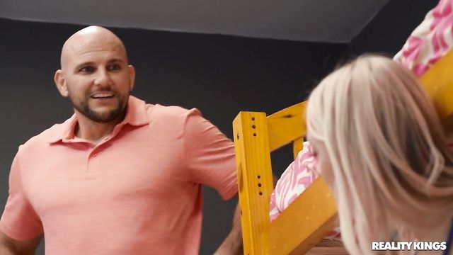 Description:Jmac is just trying to do a good deed by bringing his little sister her laundry, but when he walks into her dorm he finds her roommate, Braylin Bailey, masturbating instead! The horny blonde tells Jmac to stay because she wants some of that D, showing him she means it by taking his cock out and sucking him. This flexible spinner bounces on Jmac's big dick in the bunkbeds and even fingers her own ass as she gets her pussy fucked, before he picks her up to pound her even deeper then gives her a facial!
