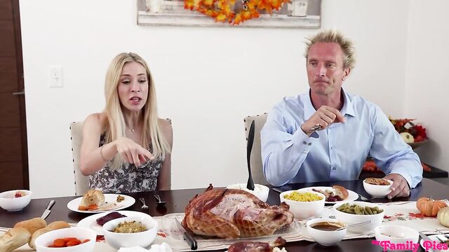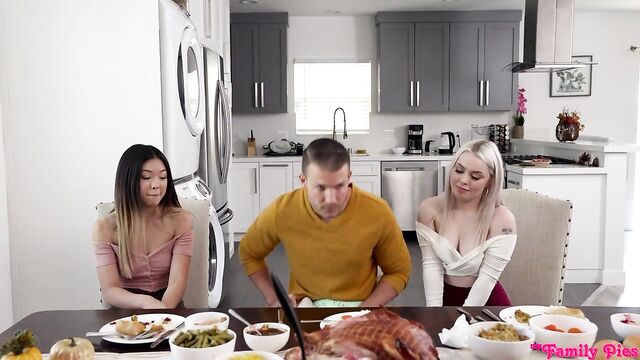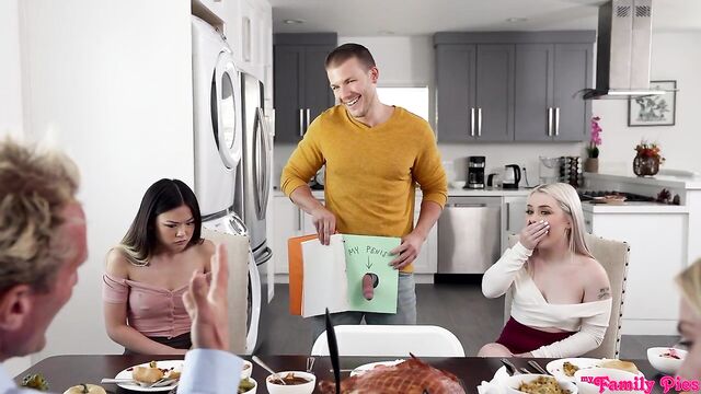 Description:For this year's Thanksgiving, Aiden Ashley and her husband Clark Kent have brought together their blended family in Lulu Chu and Codey Steele. Haley has even invited her friend, Haley Spades. While the girls are off getting dessert, Clark instructs Codey to go get a book of things he's thankful for that he's been working on all day. When the family has gathered around the table again, Codey stands and reads his book out loud. It becomes increasingly inappropriate until the final page, which features Codey's dick in a hole because he's grateful for his penis. Clark tries to send Codey to his room, but Aiden has a different punishment in mind: Codey gets to sit at the table with his dick out while everyone else eats dessert.Aiden's punishment has an unintended consequence because it puts Codey's hardon front and center between two cock loving girls. They reach out to deliver a handie right there at the table. As soon as Aiden and Clark get up to clear their places, Haley and Lulu drop below the table to share Codey's cock in a double BJ. They can't get enough of that hardon, but they're interrupted when Aiden and Clark return. Clark tells Codey his punishment for ruining Thanksgiving is to clean his stepsister's room. Dig still waggling, Codey gets up to go do it, but Aiden yells at him to put his erection away. Later, Lulu and Haley walk in on Codey as he's sniffing a pair of Lulu's panties under the guide of cleaning her room. Lulu tells him it's a good thing he found those because she was looking for them. She goes on to lift her miniskirt and show she's not wearing any underwear. Her friend Haley does the same thing. Codey tries to leave, but the girls tell him he's not going anywhere and pin him to the bed so they can have their way with him.Lulu takes the first reverse cowgirl ride on Codey's hardon as Haley rubs Lulu's clit. The girls tag out, with Haley sliding down onto Codey's dick as Lulu masturbates beside them. Haley continues to get her pussy pounded as she rolls onto her back and spreads herself wide open for her BFF's stepbrother to have his way with her juicy twat. When Codey has satisfied Haley, Lulu takes her place. Codey manages to get his stepsister to cum, then gives in to the girls begging him to stuff Lulu full of cum like a Thanksgiving turkey. Codey does as he's told, which leaves Lulu also feeling grateful for her stepbrother's dick.