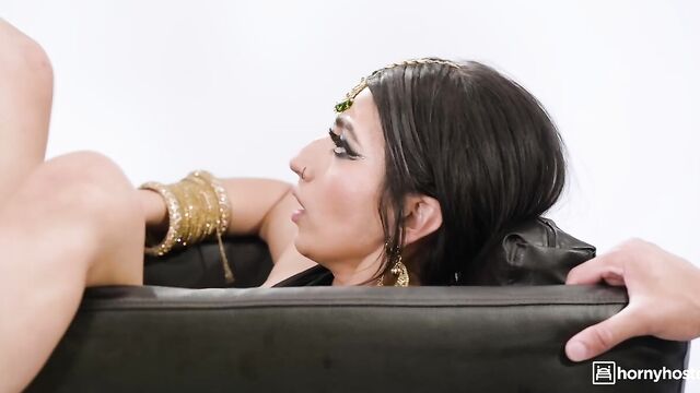 Description: Aaliyah Yasin sits on a talk show to promote her new film, flanked by her makeup artist, Jesus Reyes, and a quiet assistant. The host’s smug questions grow increasingly annoying, prompting him to briefly leave the set for a commercial break. Within seconds, Aaliyah signals Jesus, who pulls the assistant to her knees. She gives him a quick sloppy blowjob, while Aaliyah watches and touches herself, then she is dismissed. Aaliyah immediately strips, mounts Jesus on the couch, and rides him. The host returns, shocked, as they continue fucking and all he can do is watch.